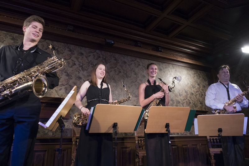 Clar4Sax - Mai 2017Lokalmatadoren „Clar4Sax“ begeistern im Kupelwiesersaal Die Chance sich im eigenen Ort präsentieren zu dürfen haben die vier MusikerInnen von „Clar4Sax“ genützt und dem Publikum einen unterhaltsamen und musikalisch hochwertigen Abend mit Klarinette & Saxophon geboten. ![]() Unter der musikalischen Leitung von Mag. Bernhard Pfaffelmaier haben die MusikerInnen Viktoria Pfaffelmaier, Hannah Welte und Florian Welte eindrucksvoll bewiesen, dass man für außergewöhnlichen Hörgenuß nicht unbedingt in die Ferne schweifen muss. Routiniert und stilsicher hat „Clar4Sax“ die Werke interpretiert und das Publikum begeistert. ![]() Mit den verbindenden Worten von Gabi Machacek über Hintergründe, Stories und lustigen Begebenheiten rund um Komponisten und Werke ein insgesamt äußerst gelungener, kurzweiliger Abend, der sich ohne Mühe in die zum Teil internationalen Acts des Kulturklubs einreiht! Bildergalerie Foto vergrößern - Mauszeiger auf Bild stellen und bei Bedarf mit Cursortasten (->) verschieben