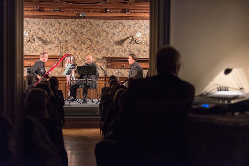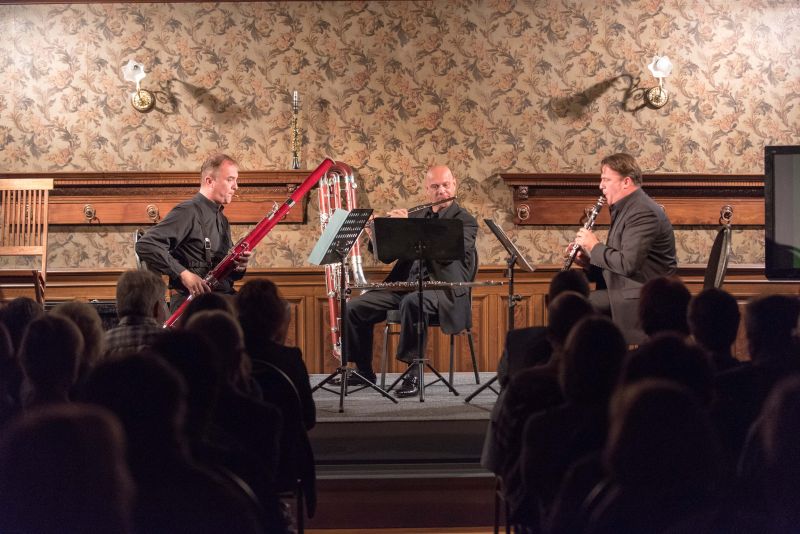 Dalbergia TrioKonzert des Dalbergia-Trios und Lesung im :KU:Z in Markt Piesting Am Samstag, dem 13. Oktober 2018, konnten die Besucher im ausverkauften Kupelwieser-Kultur-Zentrum (:KU:Z) ein kammermusikalisches Konzertereignis genießen, das aus mehreren Gründen in die oberste Kategorie einzuordnen war! ![]() Bernhard Pfaffelmaier, Klarinetten, Wolfgang Golds, Flöte, Altflöte, Piccolo und Robert Brunnlechner, Fagott, Kontrafagott, musizierten als Dalbergia Trio in selten erlebter Hochform, wobei die Musiker in ihrer Programmzusammenstellung auf den Einsatz von „Gassenhauern“ verzichteten und sehr anspruchsvolle Konzertstücke aufführten. Der Abend erhielt noch eine ganz besondere Note, weil zwischen den Musikstücken literarische Einsprengsel zu hören waren. Der Fagottist Robert Brunnlechner, der in einem kleinen Sketch in der Konzerteröffnung den Part eines – wie sich später herausstellen sollte – nicht existenten Autors Namens Viktor Vierthaler übernahm, las Texte aus seinen eigenen Werken „Wenn die Trommeln verstummen“ und „Der Bart der Aphrodite“, die gespickt mit überraschenden Wendungen und nachvollziehbarem Lokalkolorit für viele Lacher sorgten. ![]() Zurück zur Musik: Neben eigenen Werken wurden durchaus auch Werke weniger bekannter Komponisten vorgestellt. Da war etwa der zu Unrecht in Vergessenheit geratene deutschböhmische Komponist Erwin Schulhoff, dessen 1926 entstandenes Divertissement bravourös musiziert erklang. Oder das Trio op 47 in C-Dur, für Flöte, Klarinette und Fagott des 1757 in Niederösterreich geborenen Ingaz Josef Pleyel, eines Schülers von Joseph Hayden. Dieses Werk, das virtuose Anforderungen an die Musiker stellt, wurde wieder großartig musiziert. In den eigenen Kompositionen wurde die musikalische Vielfalt der drei Künstler hörbar, eine Vielfalt, die sich im Finalstück, dem von Robert Brunnlechner 2018 komponierten dreisätzigen Werk „Wer ist Franz Sedlacek?“, seinem Opus 50, zu einem Furioso entwickelte. Mit einem Kontrafagott, dem Piccolo und einer Es-Klarinette wurde das mögliche Klangspektrum dieser Holzblasinstrumente komplett ausgeschöpft. ![]() Diesem musikalisch-virtuosen Schlusspunkt folgte noch zum Ausklang eine Freddy Mercury (Queen) Komposition „Love Of My Life“, mit dem die BesucherInnen in die bei Kulturklubveranstaltungen übliche „Nachbetrachtung“, dem Treffen mit den Musikern, zum Smalltalk, geleitet wurden. Viele Bravos und ein enthusiastischer Applaus belohnten die Künstler für ihre Musikalität und die Musizierfreude. ![]() PS.: „Dalbergia“ – der Name kommt von einer der schwersten Holzarten, die auch unter dem Namen Grenadill bekannt ist und für den Bau von hochwertigen Holzblasinstrumenten, wie eben Klarinetten und Oboen, verwendet wird. Wieder einmal ein wunderbarer Abend im Kupelwieser.Kultur.Zentrum. Text : Werner Holy Fotos: Ingeborg Zeh Bildergalerie Foto vergrößern - Mauszeiger auf Bild stellen und bei Bedarf mit Cursortasten (->) verschieben